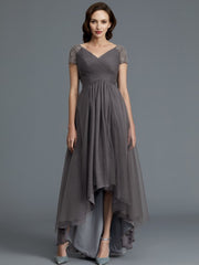 A-Line/Princess V-neck Short Sleeves Asymmetrical Tulle Mother of the Bride Dresses