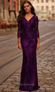 Step into elegance with Buyishang's plunging V-neck long sleeve lace mermaid maxi dress. The deep V-neck design highlights your neckline beautifully, while the long sleeves add a refined touch. The lace fabric exudes romance and artistry, and the mermaid cut creates a stunning, curvy silhouette, perfect for formal events or special occasions. The rich purple hue and intricate detailing further elevate its timeless, sophisticated appeal, making it a standout choice for any glamorous gathering.