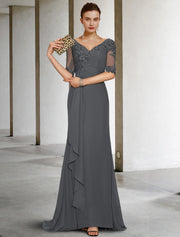 Mermaid / Trumpet Mother of the Bride Dress Vintage Elegant V Neck Sweep / Brush Train Chiffon Tulle Half Sleeve with Appliques Side-Draped