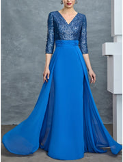 Sheath / Column Mother of the Bride Dress Wedding Guest Party Elegant V Neck Sweep / Brush Train Stretch Chiffon 3/4 Length Sleeve with Sequin Ruching