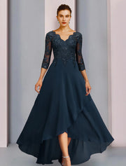 Sheath / Column Mother of the Bride Dress Wedding Guest Vintage Sparkle & Shine V Neck Asymmetrical Chiffon Lace 3/4 Length Sleeve with Pleats Sequin