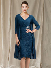 Two Piece Sheath / Column Mother of the Bride Dress Church Elegant V Neck Knee Length Chiffon Lace Half Sleeve Jacket Dresses with Appliques Crystal Brooch