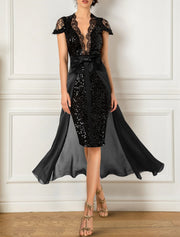 Two Piece Sheath / Column Mother of the Bride Dress Formal Wedding Guest Party Sparkle & Shine Elegant V Neck Knee Length Chiffon Sequined Short Sleeve with Bow(s) - US 2 / UK 6 / EU 32