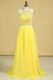 A Line Party Dresses Halter Beaded Bodice Open Back Sweep Train – Buyishang Dresses index