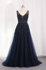 A Line V Neck Tulle Open Back Party Dresses With Applique - US 2 / UK 6 / EU 32
