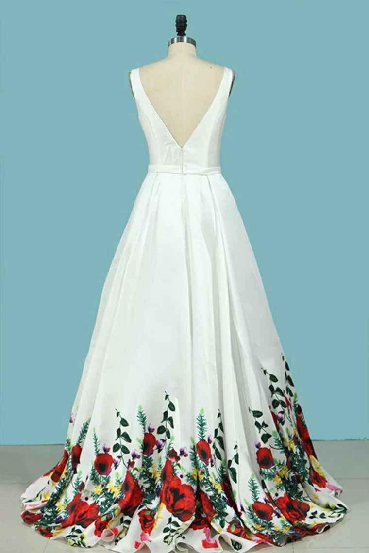 Floral Party Dresses V Neck A Line Satin