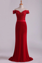 Off The Shoulder Party Dresses Spandex Burgundy/Maroon Sweep Train With Applique