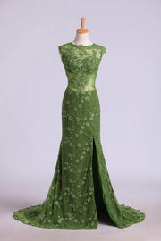 Scoop Column Party Dresses Tulle With Slit And Applique Sweep Train - US 2 / UK 6 / EU 32