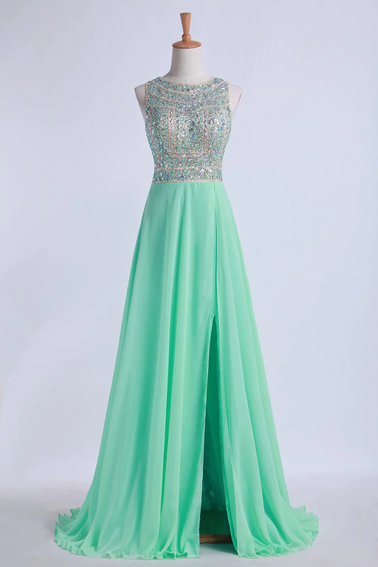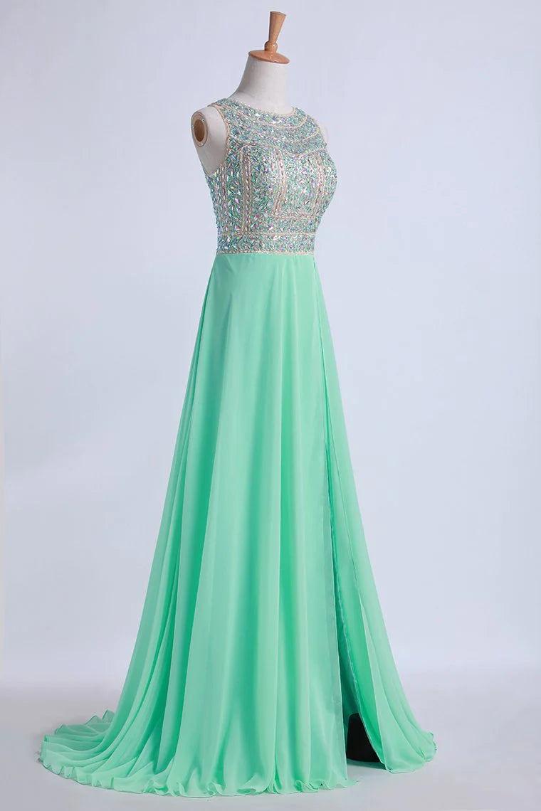 Tow-Tone Bateau Open Back Party Dresses A-Line Beaded Bodice With Slit Chiffon