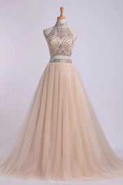 Two-Piece High Neck Party Dresses A Line Tulle With Beading