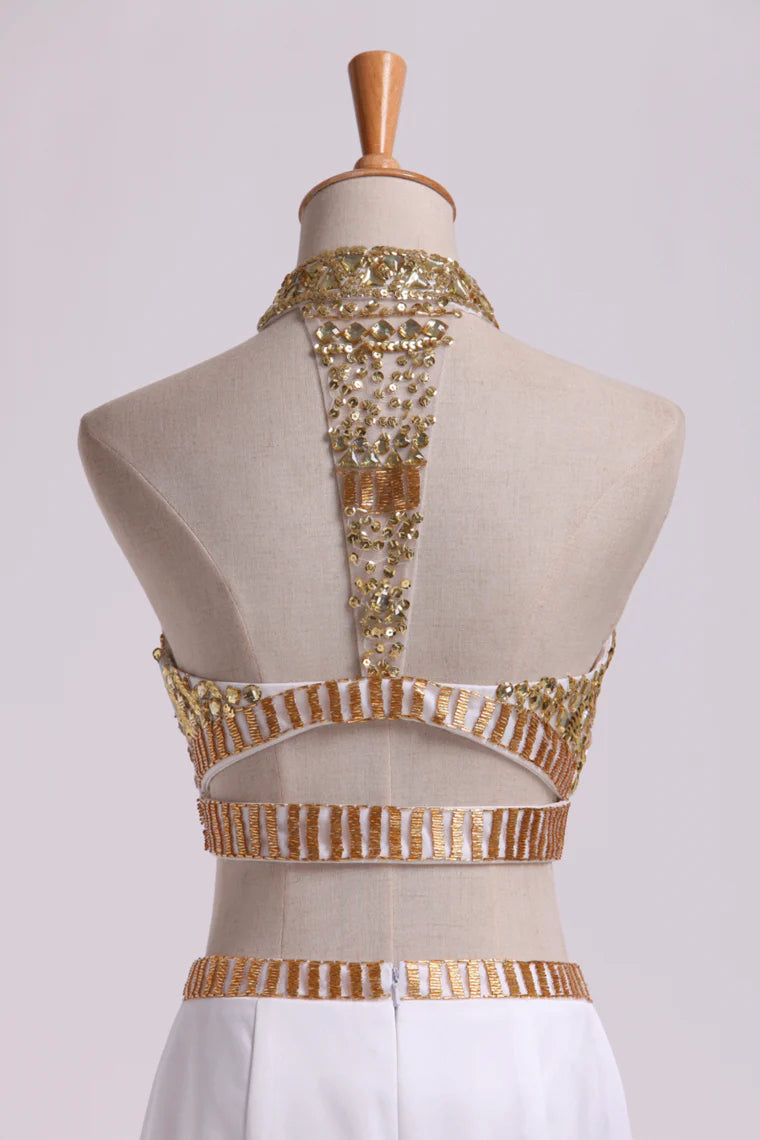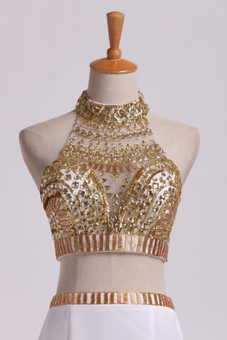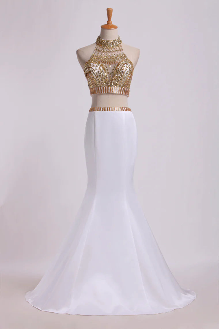 Two Pieces Beaded Bodice High Neck Party Dresses Trumpet Sweep Train