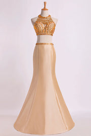 Two Pieces High Neck Party Dresses Beaded Bodice Trumpet Sweep Train