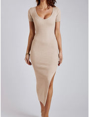 Women's Party Dress Cocktail Dress Wedding Guest Dress Midi Dress Black White Wine Short Sleeve Plain Split Summer Spring Fall V Neck Party Wedding Guest Vacation - Khaki / US 2 / UK 6 / EU 32