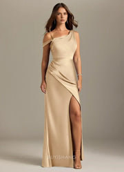 Asymmetrical Shoulder Draped Satin prom dress. Occasions: Prom, black tie events, formal weddings, and upscale parties.