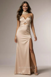 Step into alluring sophistication with Buyishang's spaghetti strap cutout draped satin maxi dress. The plunging V-neckline (paired with cross-front draping and a waist cutout), delicate spaghetti straps, and lustrous satin fabric highlight your silhouette dramatically, while the high slit and open back add layers of allure and movement. The soft blush nude hue creates a stunning, elegant fit, perfect for formal galas or evening weddings. The smooth satin material further elevates its appeal, ensuring you exude charm at any upscale occasion.