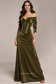 Elegant Green Off the Shoulder Velvet Corset Long Formal Dress with Sl – Buyishang Dresses index