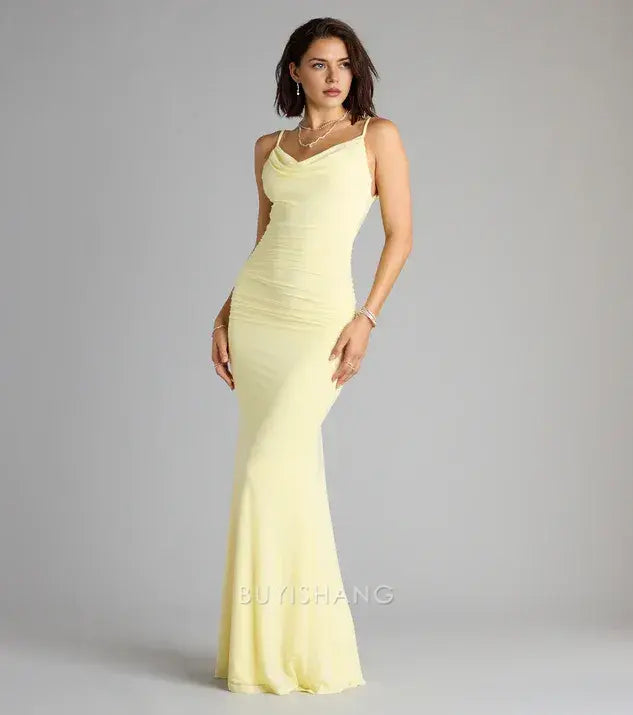 Step into elegance with Buyishang's spaghetti strap cowl neck ruched mermaid maxi dress. The delicate spaghetti straps offer a stylish look, while the cowl neck design adds a touch of allure. The ruched detailing on the bodice enhances texture and sophistication, and the mermaid silhouette creates a stunning and curvy appearance. The maxi length lends a graceful feel, perfect for formal events or special occasions.