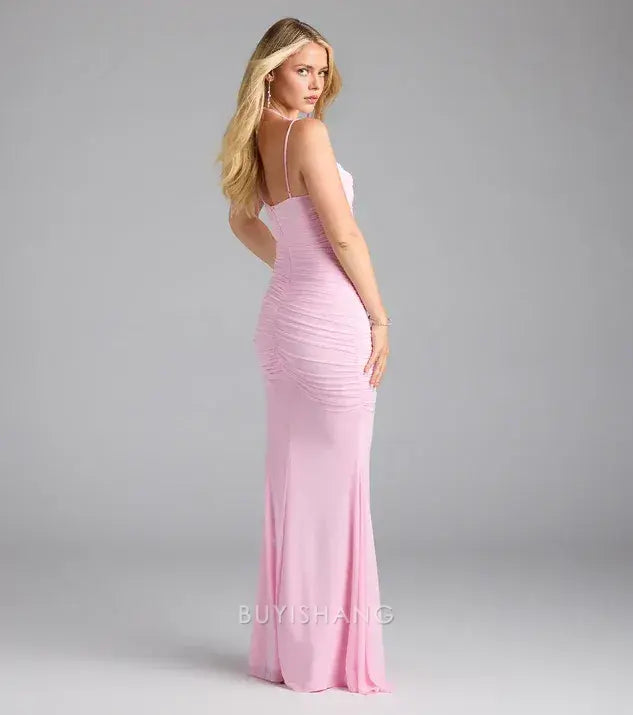 Spaghetti Strap Cowl Neck Ruched prom dress. Occasions: Prom, black tie events, formal weddings, and upscale parties.