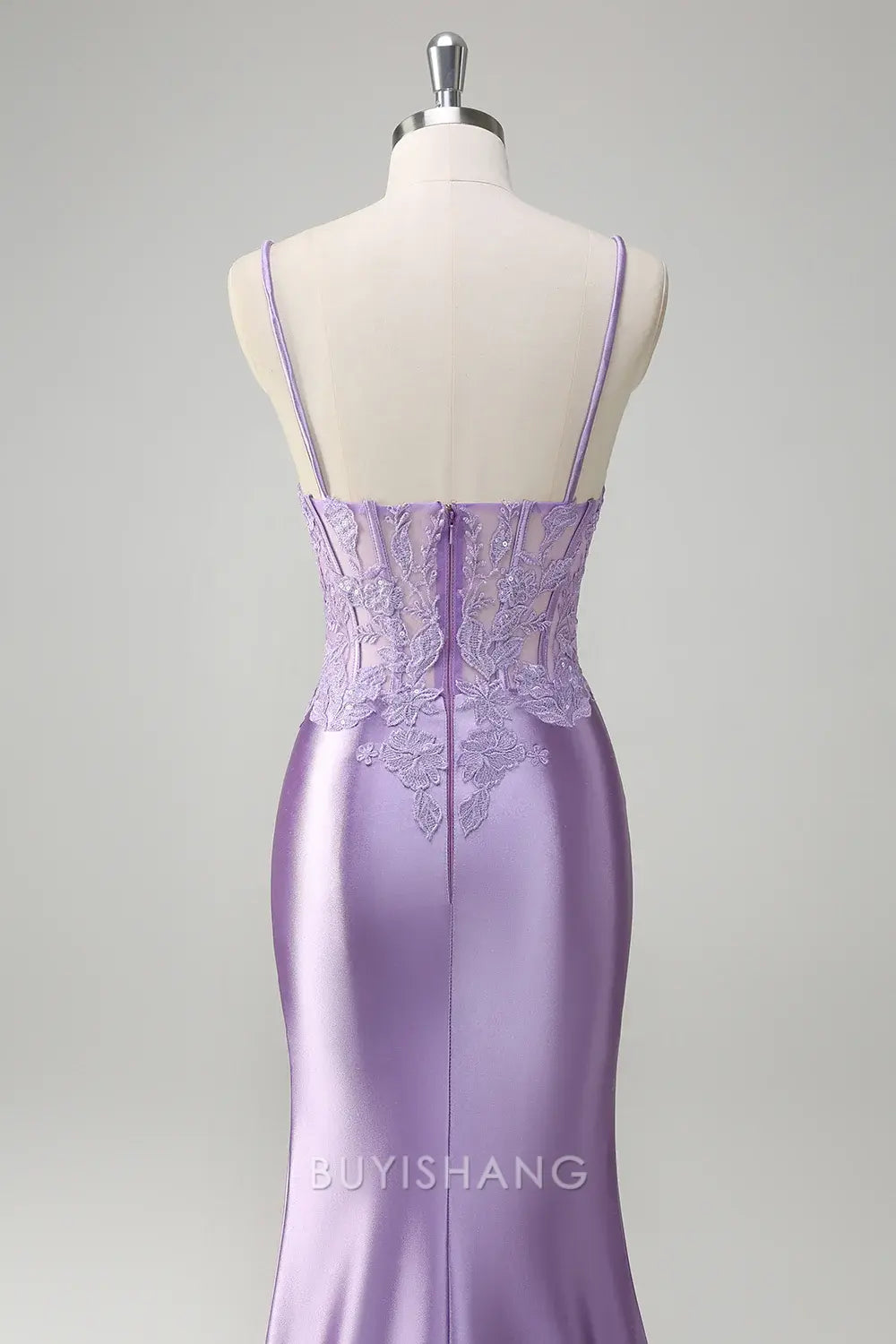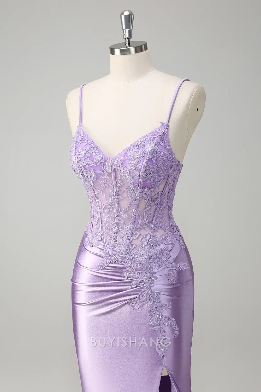 Elegant Spaghetti Strap Lace Embellished High Slit Satin Mermaid Maxi – Buyishang Dresses index