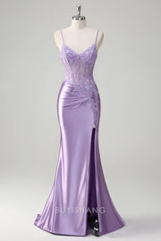 Elegant Spaghetti Strap Lace Embellished High Slit Satin Mermaid Maxi Dress Prom Dress