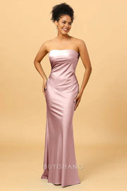 Step into elegance with Buyishang's strapless satin mermaid maxi dress. The strapless design highlights your neckline and shoulders beautifully, while the satin fabric exudes luxury and smoothness. The mermaid cut creates a stunning, curvy silhouette, perfect for formal events or special occasions. The soft mauve hue and tailored design further elevate its timeless, sophisticated appeal, ensuring you stand out at any glamorous gathering.