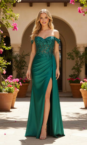 Buyishang's luxurious and vibrant ball gown is crafted from dark green satin. The off-the-shoulder design with a sweetheart neckline combines elegance and sexiness. The three-dimensional lace embroidery on the bodice adds exquisite layers, while the fitted mermaid cut hugs the figure. The high side slit enhances the sense of movement, and the open back design adds a romantic touch. The flowing train skirt exudes a luxurious sheen, making it suitable for formal occasions such as balls and banquets. It is the top choice for women who appreciate a bright and luxurious style.