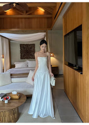 Buyishang's minimalist evening dress features a flowing A-line silhouette with a modern square neckline, crafted from luxurious white satin with a soft, lustrous sheen. The bodice is structured with boning for a tailored fit, and a lace-up back allows for personalized adjustability. It is supported by delicate spaghetti straps, while the bias-cut floor-length skirt falls in fluid, elegant folds that move gracefully with every step. The clean, unadorned design emphasizes the fabric’s natural drape and subtle shine.