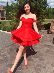 Buyishang's chic homecoming dress is crafted from premium bright red satin, featuring a flattering A-line silhouette with a flirty short length. It highlights an off-the-shoulder sweetheart neckline with delicate ruffled strap details, and the bodice is structured for a tailored fit that accentuates the waist. The skirt boasts double ruffled layers that create dynamic movement and a voluminous, playful shape. A hidden side zipper ensures easy wear, while the smooth, lightweight satin fabric guarantees all-night comfort for active events like homecoming dances and cocktail parties.
