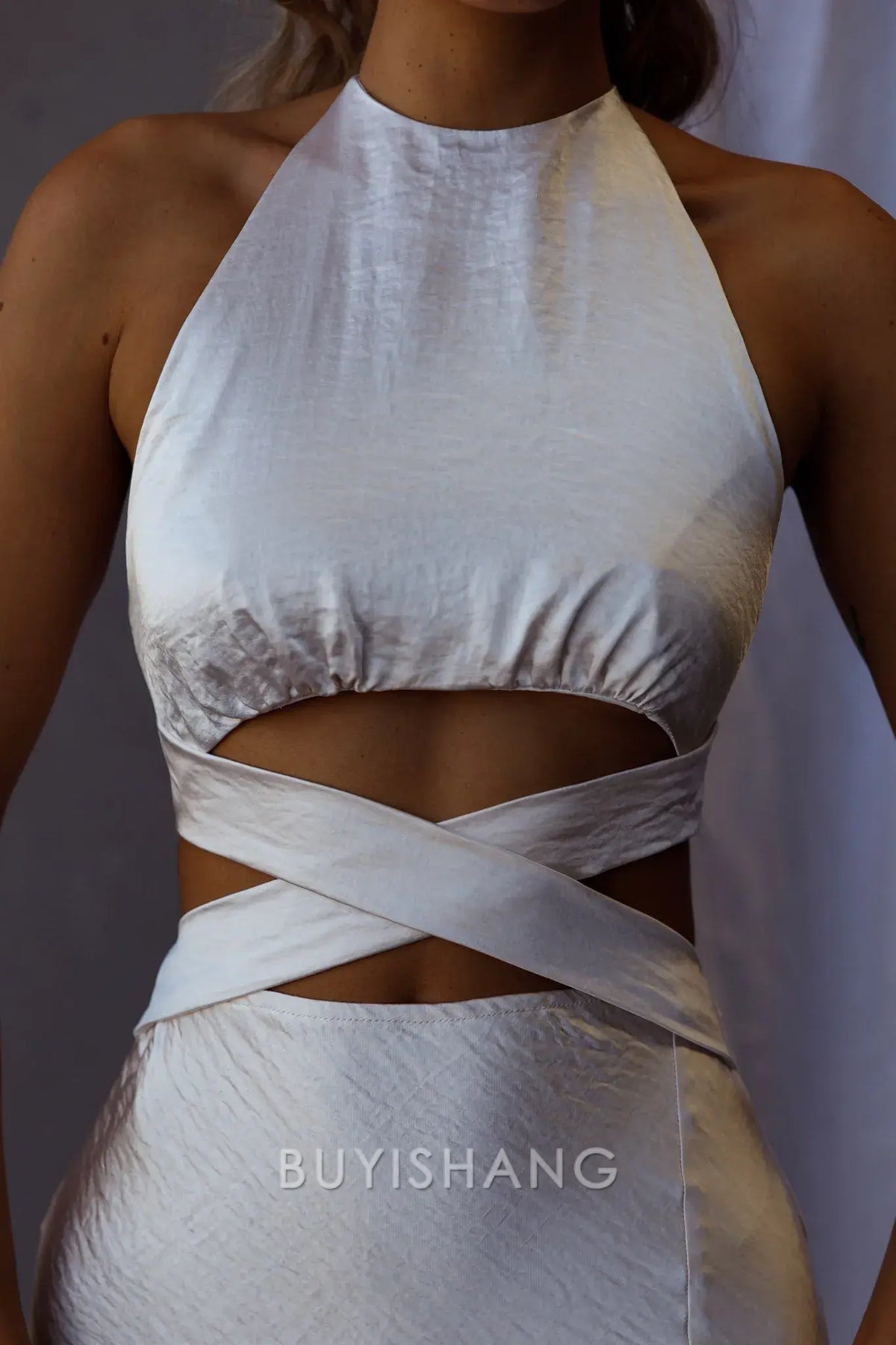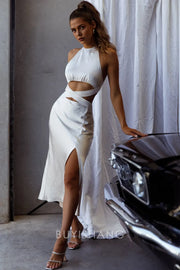 High Neck Cutout prom dress. Occasions: Prom, black tie events, formal weddings, and upscale parties.