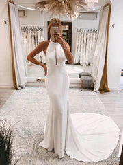 Modern Mermaid Halter Neck Satin White Floor-Length Wedding Dress