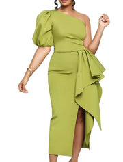 Women‘s Plus Size Curve Elegant Apple Shaped Dress Wedding Guest Party Dress Solid Color One Shoulder Short Sleeve Spring Fall Prom Dress Midi Dress Party Date Dress